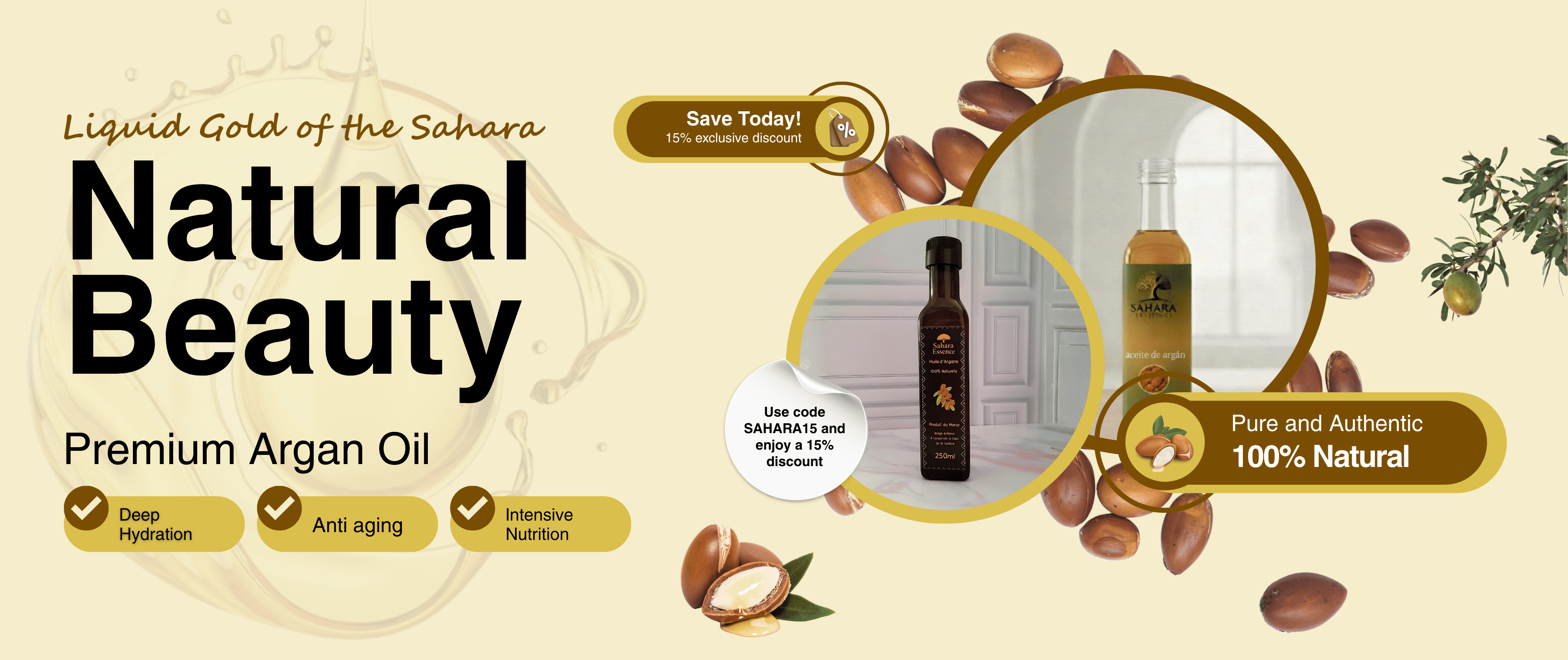 From the heart of the desert comes Sahara Essence®. 100% natural argan oil, pure daghmous honey, and artisanal recipes passed down through generations. Every drop, every spoonful, is an authentic luxury experience, designed for your daily well-being.