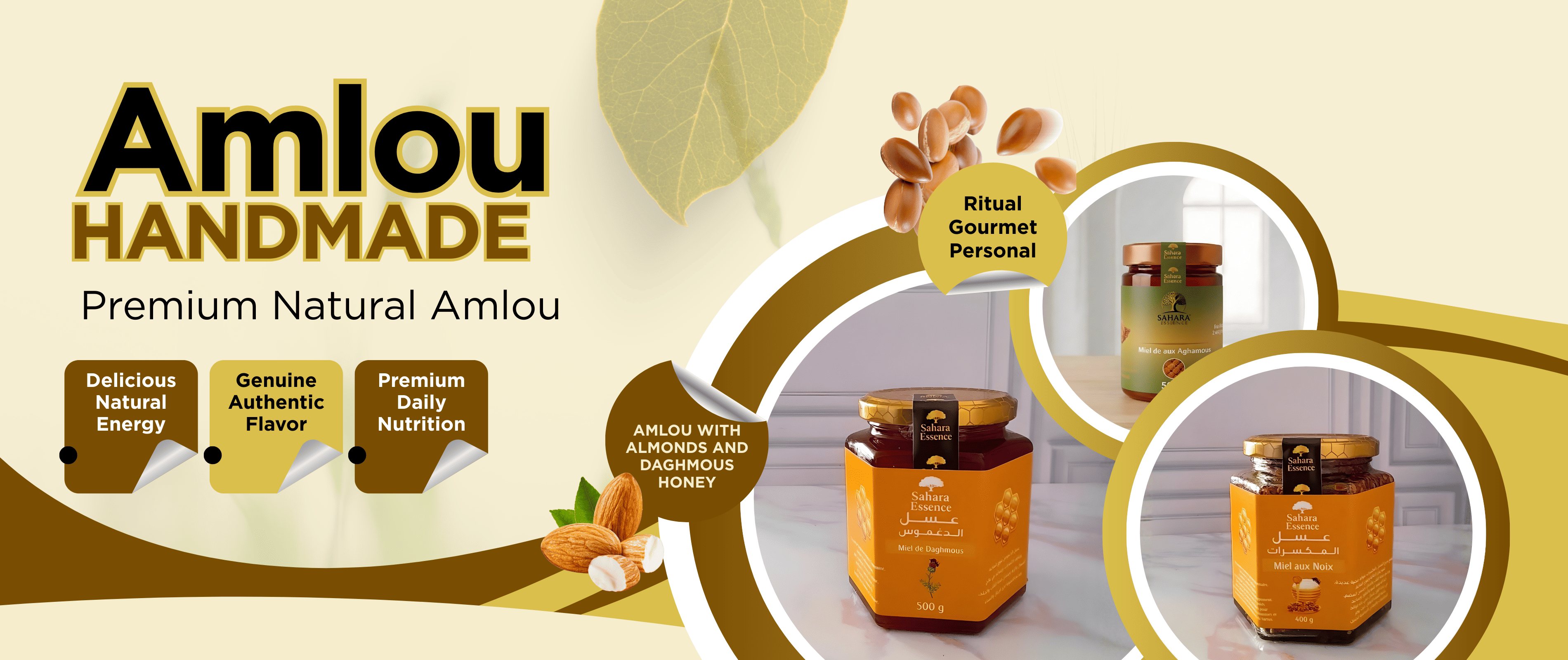 In Sahara Essence®, Amlou and honey come together to offer an authentic and nourishing experience. From breakfast to a snack, every spoonful provides balance, energy, and the luxury of pure, traditional ingredients.